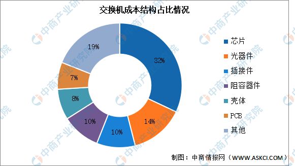 交换机主要由芯片、光器件、插接件、阻容器件、壳体、PCB等资源组成。其中芯片成本占比最高,达32%。其次分别为光器件、插接件、阻容器件、壳体、PCB,占比分别为14%、10%、10%、8%、7%。