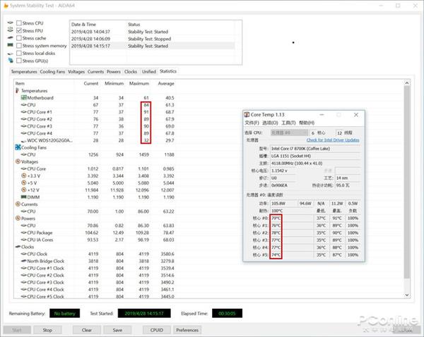 其实这里算是一个空白对照实验,图中的最高温度达到90℃是由于开了Furmak GPU压力测试导致整体温度升高。可以看到即使进行了30min的FPU单烤,CPU的核心温度也处于不到80℃的状态。