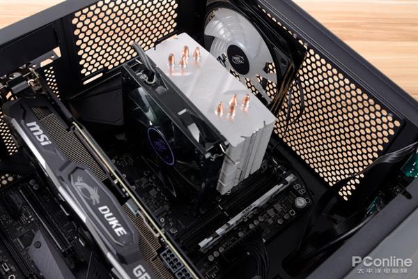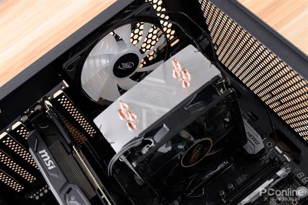 不过CPU散热器从下往上吹的方式,给自身带来的压力相当大。如果你的显卡确实过热,而CPU散热器应付CPU产生的热量绰绰有余,这样装确实没啥问题。而我们看到当CPU和GPU处于压力测试时,CPU的满载温度会上升10℃,归根结底就是CPU散热器并不能把大量热空气吹出机箱外,导致整个机箱中央部分一直积热。