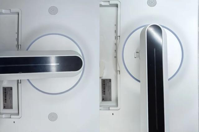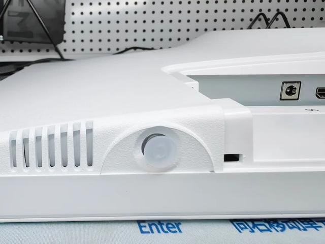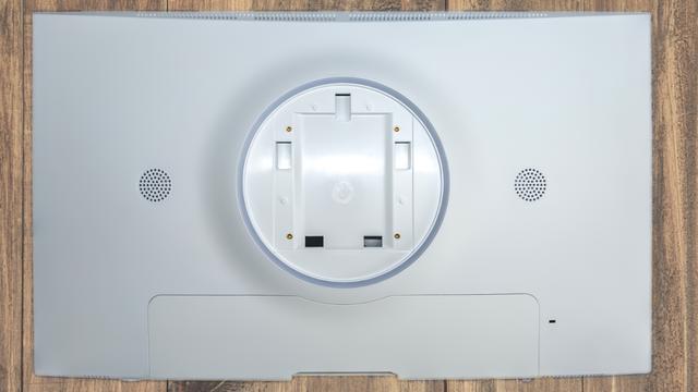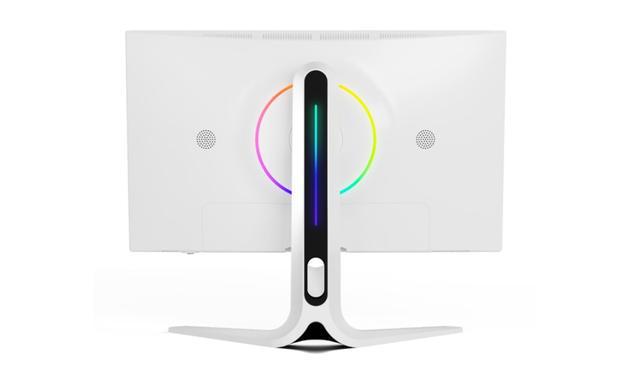 显示器背部同样为白色,中心圆形衔接处外沿还一圈RGB氛围灯带,两侧各有一个扬声器。可以看出来这款显示器外观设计走的是时尚简约风,白色看起来很干净,加上黑色、红色点缀及氛围灯装饰,视觉上不会单调。