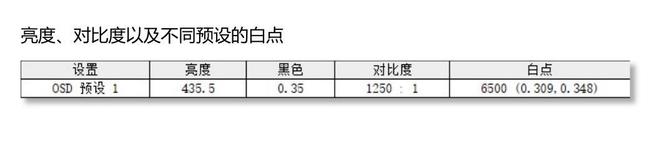 采用OSD预设测试,白点色温为6500K,非常标准。然后亮度为435.5cd/㎡,这里说明一下,测试是在关闭HDR模式下进行的,如果开启HDR模式,亮度值还会更高,峰值亮度是486cd/㎡。