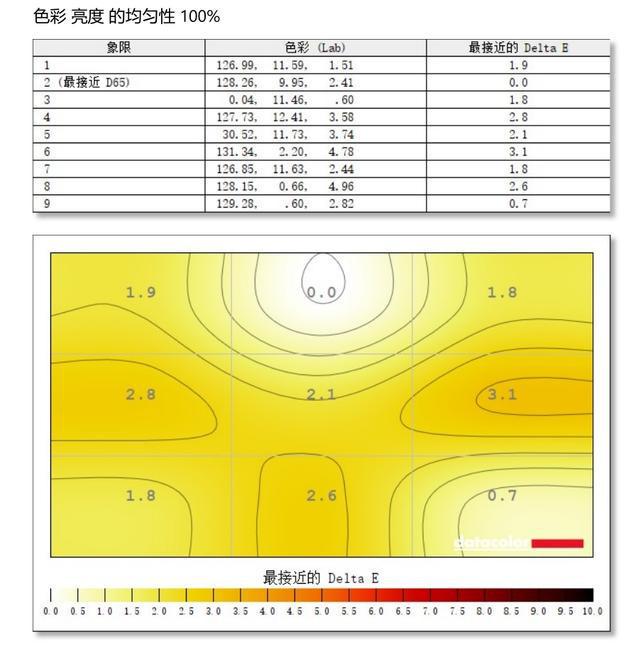 继续看色准表现,官方给出的数据是△E≤2,用校色仪测试的△E最大值为1.95,最小值为0.14,平均值为0.63,与官方标称值一致,平时做设计、剪辑也没啥问题。