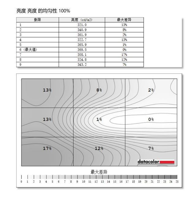 亮度均匀性测试原理与色彩均匀性一样,灰域代表着该区域的亮度值与标准亮度值的差值,灰色越深,代表亮度差异越大。