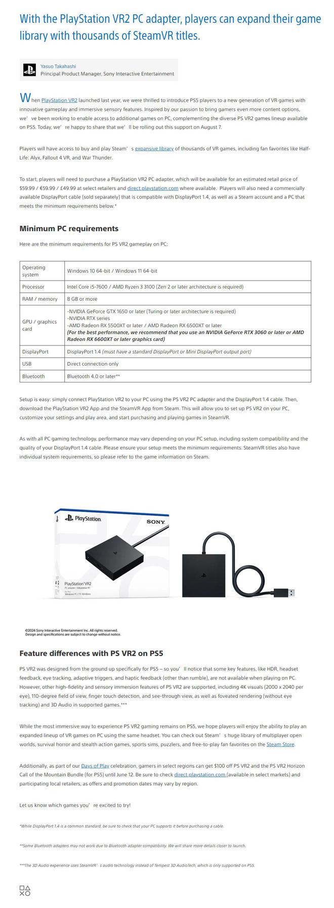索尼还表示,当在和记娱乐官网PC上使用时,HDR、头显反馈、眼球追踪、自适应扳机和触觉反馈(除了震动)等功能将不可用。此外索尼还发布了在PC上使用该设备的最低要求。