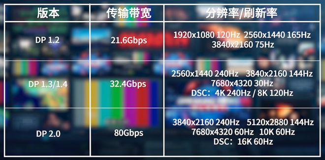 既然是为了PC而生,DP接口的各项数据必然都十分亮眼,连最基础的1.2版本都能支持4K60,1.4版本更是堪称“高刷电竞神器”,而搭配DSC技术的2.0版本,甚至可以达到惊人的16K 60Hz。