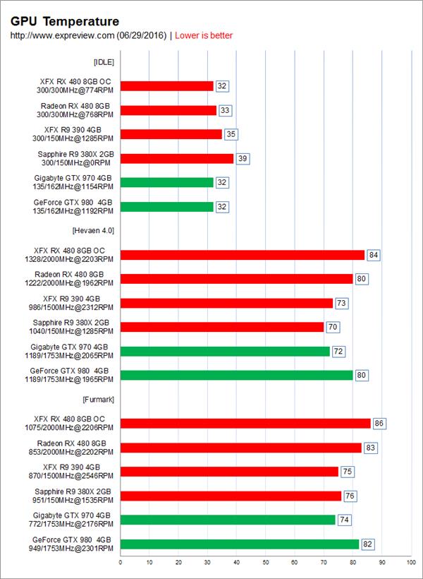 前面的性能测试中提到,虽然XFX RX 480 OC显卡频率只比公版高出5%,但实际性能可有10%的增幅,原因之一就在于该卡的温度上限也高了,从公版的80癈左右提高到了86癈,更高的温度上限有助于显卡更多地运行于高频率下,进而提升性能。
