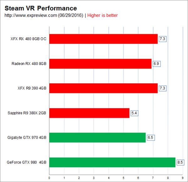 得益于较高的频率,Steam VR性能测试中,XFX RX 480 OC显卡从之前公版的6.9分提升到了7.3分,与R9 390显卡持平。