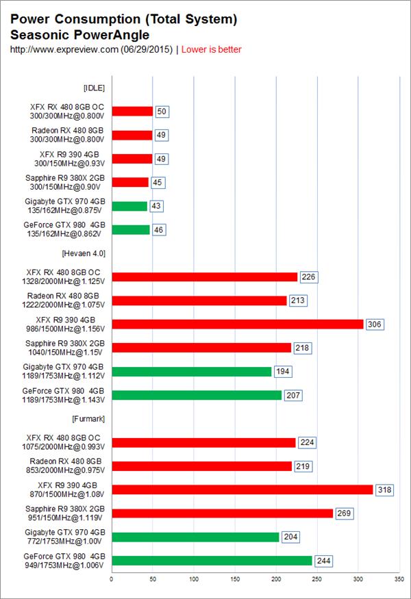 虽然频率只比公版RX 480高出5%,但实际上XFX RX 480 OC显卡的性能增幅比频率增幅更高,原因是显卡的温度上限也高了一些,提高了高频率占比,其实际性能比公版RX 480领先5-10%,平均7%左右。别小看这个7%,这点提升已经让它的性能达到了GTX 980的水平,算起来性价比是更高了。