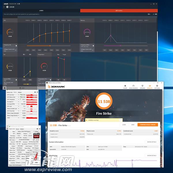 XFX R9 480显卡本身频率就比较高,最终超到了1355MHz,显存频率2095MHz,FireStrike得分为11538分。