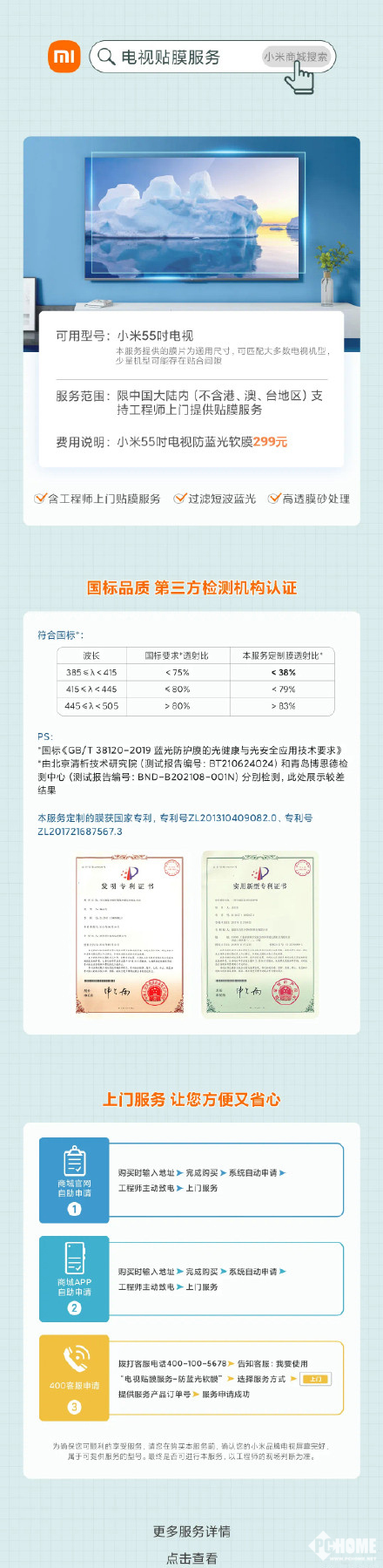 12月7日,小米官方宣布将会推出“防蓝光”电视贴膜服务,可用型号为55英寸电视。
