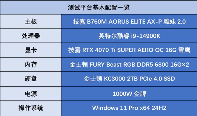 看完这块主板的基本配置,我们就直接借助测试平台来看一看这块主板在实际游戏当中究竟有着怎样的表现吧。配置方面,我们直接为这块主板搭配了i9-14900K旗舰处理器,来看看这块主板能不能满足这颗旗舰处理器的性能需求。显卡则是搭配了技嘉自家的RTX 4070 Ti SUPER AERO OC 16G雪鹰,16GB的大显存搭配纯白外观也是相当值得选择。其他配置详见下表。